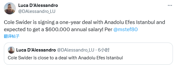 55世纪官网此前名记Stein报道,消息人士透露,科尔-斯威德接近加盟土耳其联赛安纳托利亚艾菲斯队,今日欧洲篮球记者Mihalis Stefanou报道,斯威德将和艾菲斯签约一年,薪水预计为60万美元。